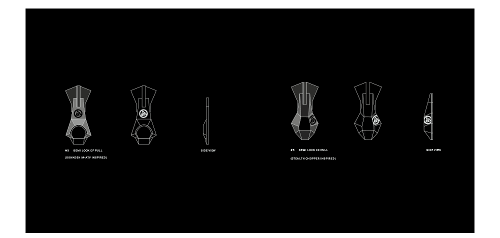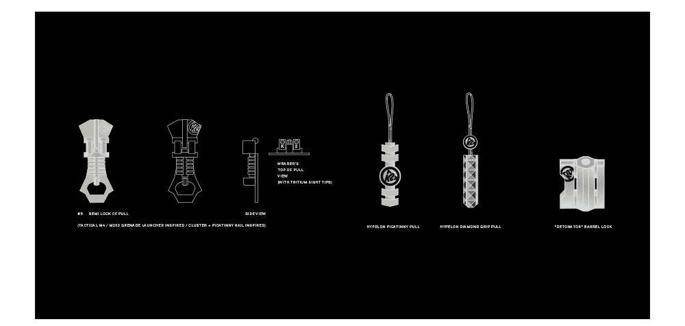 More zipper pulls and a cord lock design inspired by military, modular/functional systems: Picatinny rails, Tritium (glow in the dark) details, wet & gloved environment texturing.