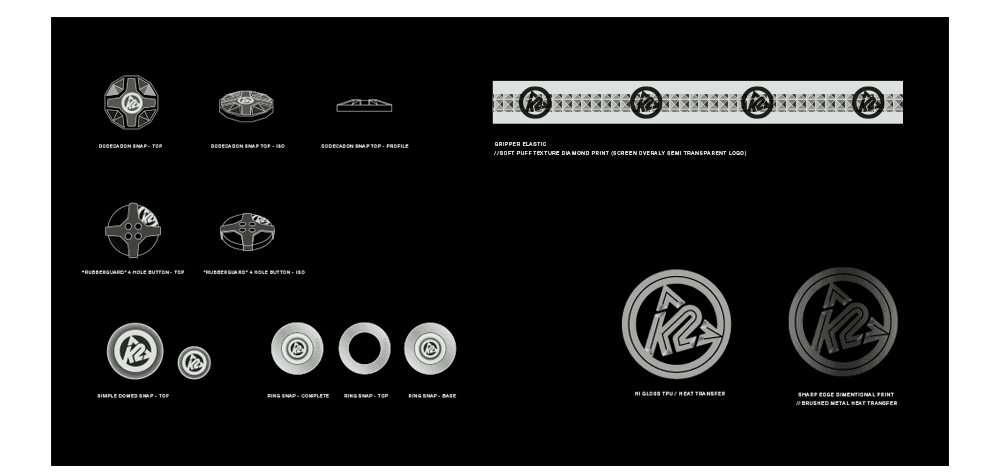 Buttons, Snaps, Badging, and Interior trims. Designed to provide 'connective tissue' to produce economies of scale. They will pair with and provide continuity for any combination within the 'parent' system.