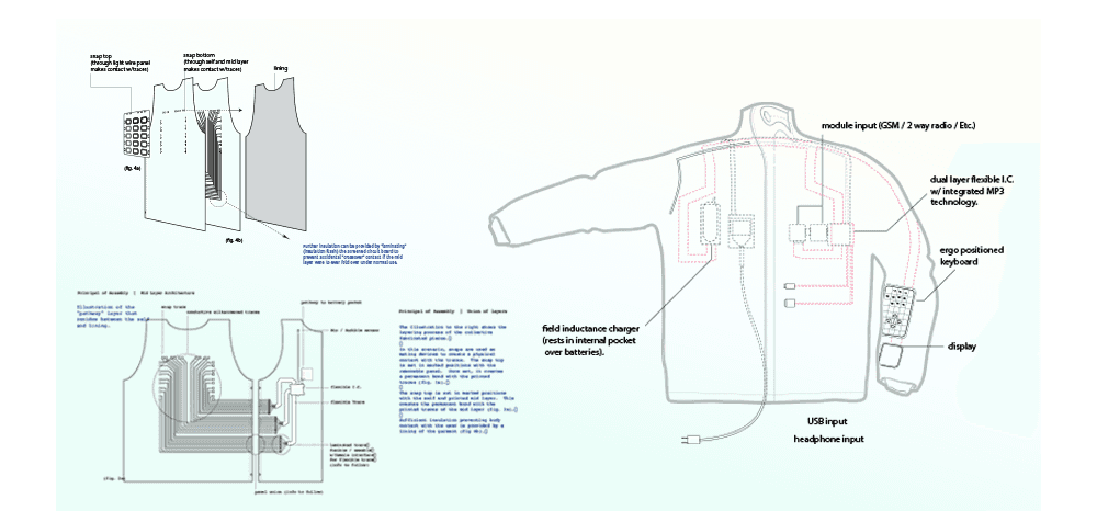 When I was in the IT Org for Levi's, I had the opportunity to work on a special project. Levi's was an M.I.T. TTT (Things That Think) Consortium member and my manager at that time knew of my technical apparel design background and said "hey, go to the Consortium this year and find us something special to do from what is presented". Fast forward a year later after seeing a proof of concept for a 'Fabric Area Network' (FAN) that M.I.T.'s Media Lab produced (by Rhemi Post), we were already engaged and near proto-complete. We collectively partnered with Motorola, Philips UK, Levis UK, and of course, M.I.T. to produce the following.
