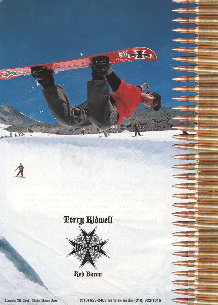 This is my photo of the iconic Terry Kidwell, the 'father' of freestyle, at Windell's Mt. Hood summer camp halfpipe. Hazmat Snowboards featured this in an advertising campaign across various industry publications.