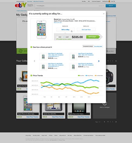 My Gadgets was an eBay portal that was integrated into the Electronics Marketplace. Users could easily add electronics and then see the ʻnet worthʼ of an item or an aggregate of a collection. It provided further convenience for listing an item by leveraging historical sales and catalog data, automation for auto-fill, and setting target price alerts against market trends (popularity) based on other users’ selling trends.